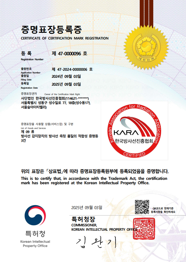 한국방사선 진흥 협회는 방사선 계측기(서베이미터), 방사선 발생 장치 및 방사선 차폐소재에 대한 KOLAS 제품 인증 분야 공인 제품 인증기관 인정을 추진하고 있습니다.